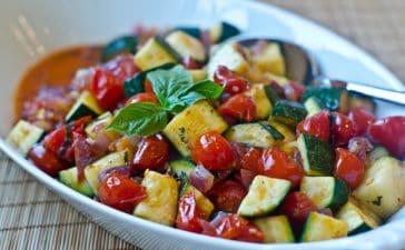 · قطعى الكوسا إلى مكعبات والطماطم الكرزية إلى أنصاف والبصل إلى مكعبات صغيرة الحجم . · سخنى زيت الزيتون فى...