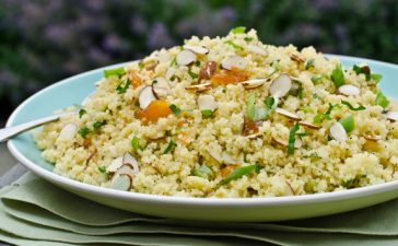 · اغلى المرق مع الزبدة وربع ملعقة صغيرة من الملح فى وعاء متوسط الحجم وعندما يغلى أضيفي الكسكس وقلبي ....