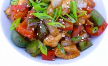 · سخنى القليل من الزيت النباتى فى مقلاة كبيرة غير لاصقة على نار عالية ثم ضعى مكعبات صدور الدجاج وقلبي...