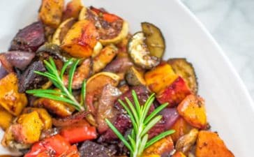 · بعد تقطيع الخضروات ضعيها في صينية كبيرة الحجم وغير لاصقة ثم أضيفي الزيت والخل البلسمي وإكليل الجبل والأوريغانو والملح...