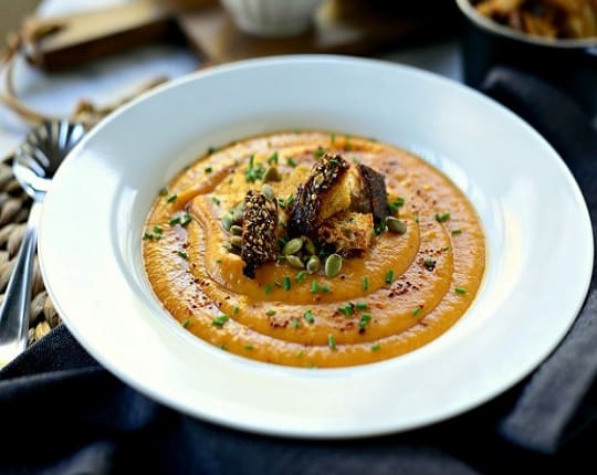 -قدمي حساء البطاطا وزيني الطبق بالخبز المحمص والصنوبر .