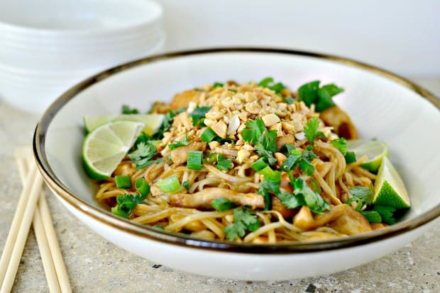 الصلصة التايلاندية : • 4/1 كوب سكر بني فاتح • 4/1 ملعقة صغيرة فلفل ابيض • 2 ملعقة صغيرة معجون التمر الهندي • 1 ملعقة كبيرة صلصة حارة • 4/1 كوب صلصة سمك • 4/1 كوب مرق دجاج خالي الدسم • 1 ملعقة كبيرة نشا ذرة • 1 ملعقة كبيرة ماء بارد الدجاج : • 2/1 كيلو شرائح صدور دجاج خاليه من العظم • 1 ملعقة كبيرة نشا ذرة • 3 ملعقة صغيرة صلصة صويا • 1 باكيت معكرونة • 1 ملعقة كبيرة زيت زيتون • 4 فص ثوم طازج • 4 بصل اخضر مقطع شرائح • 1 كوب براعم • 3/1 كوب سوداني مملح محمص مفروم • 4/1 كوب كزبرة طازجة • شرائح ليمون