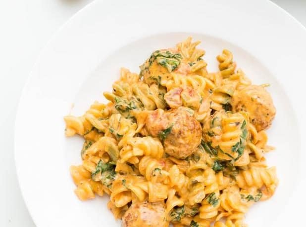• 2 كوب صلصة المكرونة<br /> • 450 جرام كرات اللحم (كفتة مطبوخة)<br /> • 2 كوب كريمة طهي<br /> • 450 جرام مكرونة مسلوقة (حسب الذوق)<br /> • 3 كوب سبانخ مفروم<br /> • 1 كوب مبشور جبن البارميزان<br /> • ملح وفلفل وبودرة ثوم، حسب الذوق<br /> • زيتطريقة التحضير :
