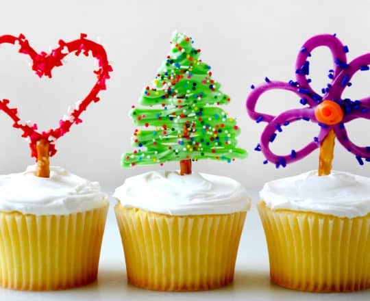 – اتركي الشوكولاتة لتجف ثم اغرسي عصا البريتزل في منتصف كريمة الكب كيك وقدميه.