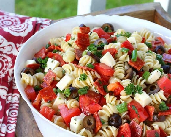 • 450 جرام مكرونة مسلوقة • 160 جرام مكعبات جبن موتزريلا • 160 جرام مكعبات بيبرونى • 2 حبة طماطم مقطعة مكعبات • 1/2 كوب مكعبات فلفل أحمر حلو • ½ كوب شرائح زيتون • ¼ كوب بقدونس مفروم • ¼ كوب بصل أحمر مفروم • 4 حبة بصل أخضر مفروم • مقادير الدريسنج الايطالى :- • ¾ كوب زيت زيتون • 3 ملعقة كبيرة خل ابيض • 2 ملعقة كبيرة ماء • 1 فص ثوم مفروم • 2 ملعقة صغيرة ملح • 2 ملعقة صغيرة سكر • ½ ملعقة صغيرة فلفل أسود • 1 ملعقة كبيرة أوريجانو طازج مفروم • 1 ملعقة كبيرة إكليل الجبل طازج مفروم • 1 ملعقة كبيرة زعتر طازج مفروم • 1 ملعقة كبيرة ريحان طازج مفرومطريقة التحضير :