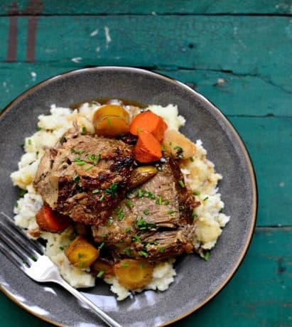 • لحم الكتف الغير مقطع • ملح كوشير • فلفل اسود • 2 حبة جزر مفروم • 2 قصب كرفس مفروم • 1 حبة بصل كبيرة مفرومه • 3 فص ثوم مقشر • 2 كوب عصير تفاح • 1 كوب مرق دجاج خالي الدسم • 6 حبات جزر مقطعة إلي انصاف • 2 ملعقة صغيرة زعتر طازج مفروم • 1 ملعقة كبيرة اوراق بقدونس مفروم • بطاطا مهروسهطريقة التحضير :
