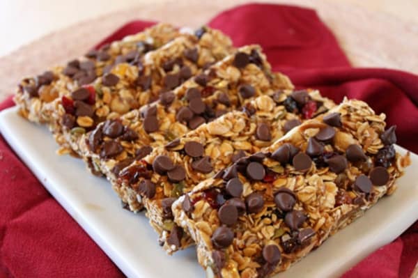 <br /> • 2/1 2 كوب شوفان <br /> • 2/1 كوب جوز هند مبشور <br /> • 2/1 2 كوب فاكهة ومكسرات<br /> • 2/1 كوب سكر بني <br /> • 2/1 كوب عسل <br /> • 4 ملعقة كبيرة زبدة<br /> • 2 ملعقة صغيرة مستخرج فانيليا <br /> • 1 ملعقة صغيرة ملح<br /> • 4/1 كوب زبدة فول سوداني <br /> • 3/1 كوب رقائق شوكولاته <br />