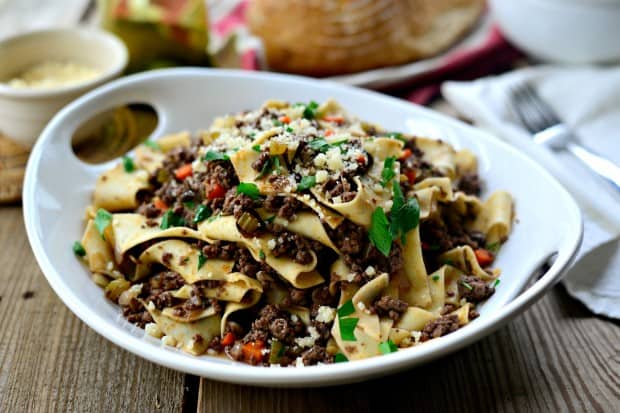 •2 ملعقة كبيرة زبدة غير مملحة <br /> •1 كوب بصل اصفر مكعبات <br /> •2 حبة جزر مكعبات <br /> •2 قصب كرفس مكعبات <br /> •4 فص ثوم مفروم<br /> •2 كوب فطر مفروم <br /> •1 كيلو لحم مفروم <br /> •3 ملعقة كبيرة معجون الطماطم <br /> •2/1 كوب خل بلسميك <br /> •2 كوب مرق لحم <br /> • زعتر أخضر <br /> • ورق غار <br /> •1 ملعقة صغيرة ملح <br /> •2/1 ملعقة صغيرة فلفل أسود <br /> •2/1 كوب بقدونس طازج مفروم <br /> • معكرونة النوع المفضل <br /> • جبن بارميزان للتزيينطريقة التحضير :