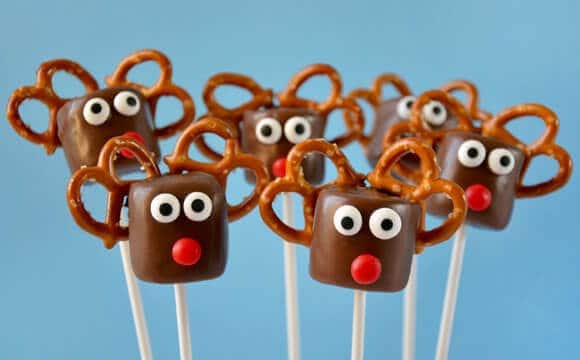 · قومي بتثبيت حلوى العيون والحلوى الحمراء لتشكيل ملامح الرنة، كما هو موضح