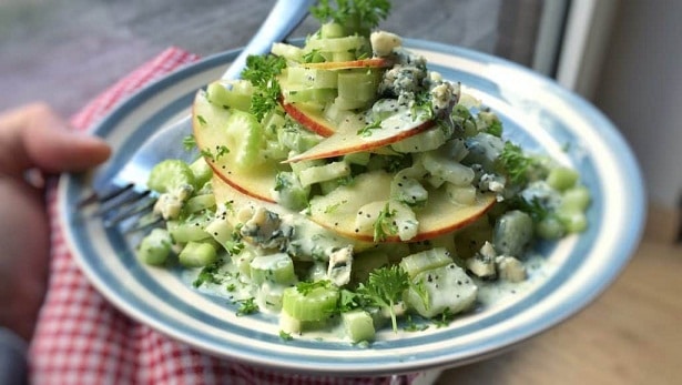 • 4 ساق كرفس طازج • 1 حبة تفاح أحمر • 2 ملعقة كبيرة جبن أزرق • 1 ملعقة كبيرة جبن كريمى • 5 ملعقة كبيرة كريمة طهى • 1 ملعقة صغيرة بذور الخشخاش • 1 ملعقة كبيرة عصير ليمون • فلفل أسودطريقة التحضير :