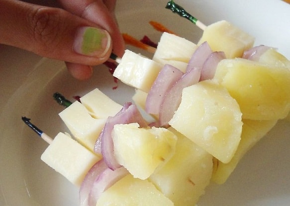 – اغرسي مكعب بصل ثم مكعب بطاطس مسلوقة.