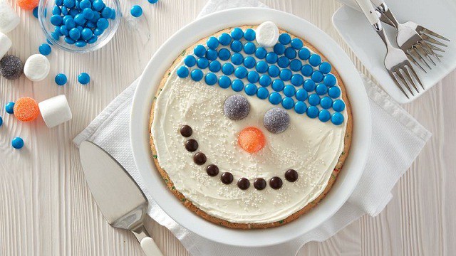 – زيني فطيرة الكوكيز بالكريمة وشوكولاتة إم آند إمز والحلوى الملونة لتشكيل وجه رجل الثلج.