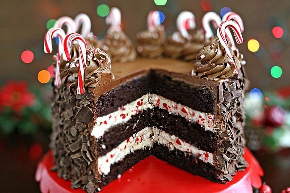• مقادير كيك الشوكولاته :- • 170 جرام زبدة فى درجة حرارة الغرفة • ¾ كوب سكر • ¾ كوب سكر بنى داكن • 3 بيضة فى درجة حرارة الغرفة • 1 ملعقة كبيرة فانيليا سائلة • 2/1 1 كوب من الحليب الكامل الدسم فى درجة حرارة الغرفة • 2 كوب طحين • 1 كوب كاكاو غير محلى • 2/1 1 ملعقة صغيرة بيكنج صودا • ¾ ملعقة صغيرة ملح • مقادير الفورستينج :- • ¾ كوب بياض بيض سائل • 6 كوب سكر بودرة • ½ ملعقة صغيرة ملح • 3 كوب زبدة فى درجة حرارة الغرفة • 1 ملعقة كبيرة فانيليا سائلة • 2 ملعقة صغيرة نكهة النعناع • 170 جرام شوكولاته مذابة وباردة • 1 كوب حلوى بونبون ( كاندى ) • 3 كوب شوكولاته مبشورة أو شوكولاته فارمسيل داكنةطريقة التحضير :