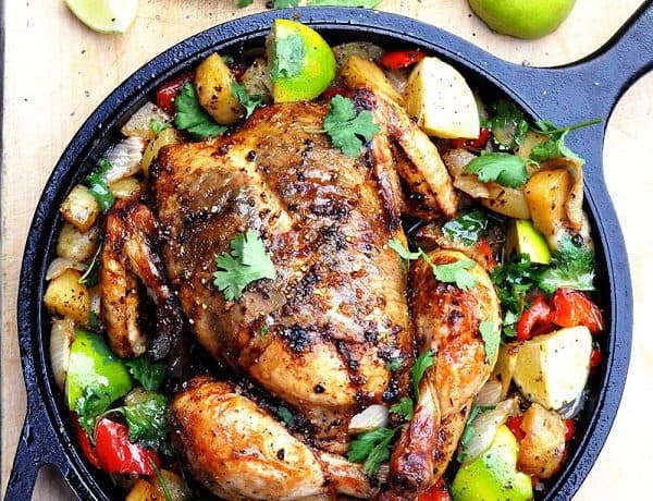 • 100 جرام زبدة • 2 ملعقة كبيرة صلصة مكسيكية مدخنة • دجاجة كاملة وزن كيلو ونصف • 3 حبة بطاطا كبيرة مقطعة مكعبات • 2 حبة بصل مقطع مكعبات • 2 حبة فلفل أحمر مقطع • 1 باقة كزبرة خضراء مفرومة • 2 ملعقة كبيرة زيت زيتون • 6 فص ثوم مقشر • 2 ليمونة مقطعة أرباع • 2 ملعقة كبيرة أوريجانو مجفف • ملح وفلفل أسودطريقة التحضير :