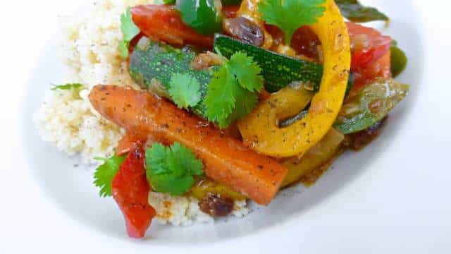 قدمى الخضروات المطبوخة فوق الكسكسى الساخن واستمتعى به