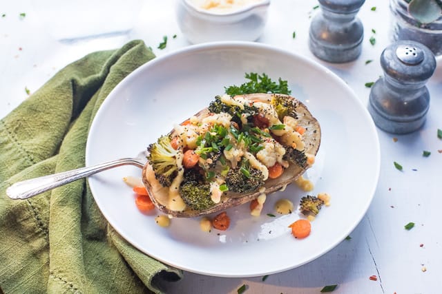 • 4 حبة بطاطس متوسطة الحجم • 1 ملعقة كبيرة زيت جوز الهند • 2 كوب بروكلي • 2 كوب جزر مقطع شرائح • 2 كوب قرنبيط مفروم • 4/1 كوب ثوم معمر مفروم • ملح وفلفل للصلصة: • 1 كوب بطاطس مقشرة ومقطعة مكعبات • 2/1 كوب جزر مفروم • 3 ملعقة كبيرة ماء جوز الهند • 3 ملعقة كبيرة خميرة فورية • 1 ملعقة كبيرة زيت زيتون • 1 ملعقة صغيرة عصير ليمون • 4/3 ملعقة صغيرة مسحوق الثوم • 4/1 ملعقة صغيرة مسحوق البصل • 4/1 ملعقة صغيرة كمون • ملح وفلفلطريقة التحضير :