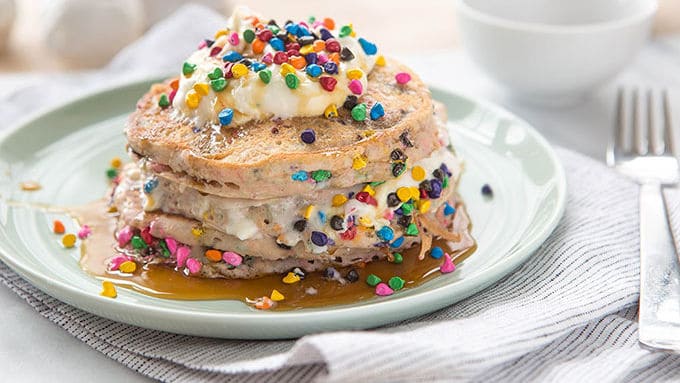 • 2/1 1 كوب طحين لجميع الأغراض<br /> • 2 ملعقة صغيرة بكينج بودر<br /> • 2/1 ملعقة صغيرة بكينج صودا<br /> • 1 ملعقة كبيرة سكر<br /> • 4/1 ملعقة صغيرة ملح<br /> • 2/1 1 كوب حليب رائب<br /> • 1 حبة بيض، كبيرة الحجم<br /> • 2 ملعقة كبيرة زبدة غير مملحة<br /> • زيت، للقلي<br /> • رقائق شوكولاتة فارمسيل ملونة<br /> • كريمة مخفوقة <br /> • شراب القيقب أو عسل، للتقديم