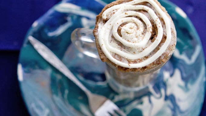 ضعي القدح في الميكروويف لمدة 3 دقائق حتى ينضج الكيك.