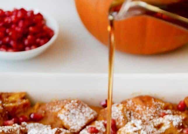 • 12 كوب مكعبات الخبز (1 بوصة) • 2/1 1 كوب هريس اليقطين • 5 حبة بيض كبير الحجم • 2 كوب حليب كامل الدسم • 4/1 كوب سكر • 2 ملعقة صغيرة توابل اليقطين • 1 كوب كريمة • 1 ملعقة كبيرة فانيليا سائلة للتقديم: • شراب القيقب أو العسل • مسحوق السكر • 2/1 كوب بذور الرمانطريقة التحضير :