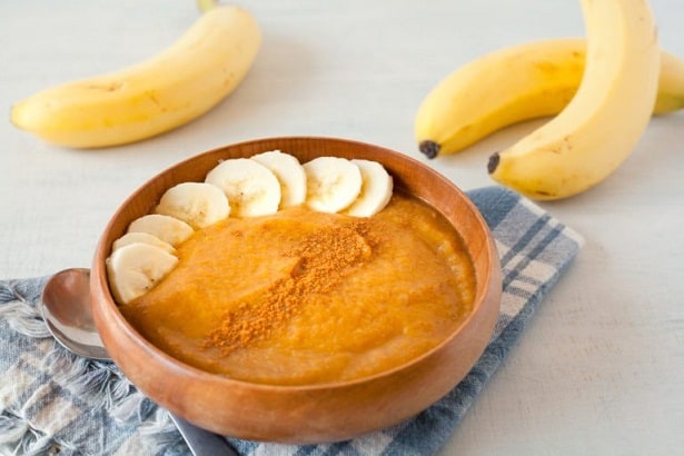 · ضعي السموثي في بولة التقديم وزيني سطحه بشرائح الموز.