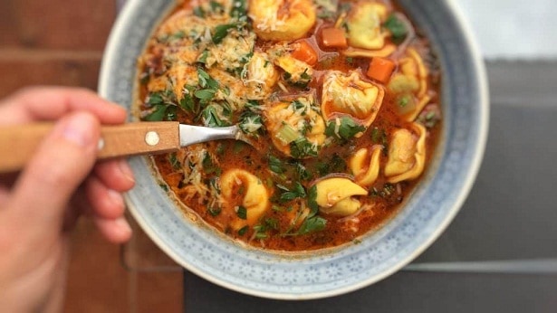 • 300 جرام مكرونة التورتلينى • 2/1 3 كوب من مرق الدجاج أو الخضار ( دافئ ) • 450 جرام طماطم مفرومة أو معلبة • 1 حبة بصل صغيرة مفرومة • 3 فص ثوم مفروم • 1 حبة جزر مقطعة مكعبات صغيرة • 1 ساق كرفس مقطع مكعبات صغيرة • 4 ملعقة كبيرة جبن بارميزان مبشورة • 1 ساق روزمارى طازج • زيت زيتون • ملح وفلفل أسودطريقة التحضير :