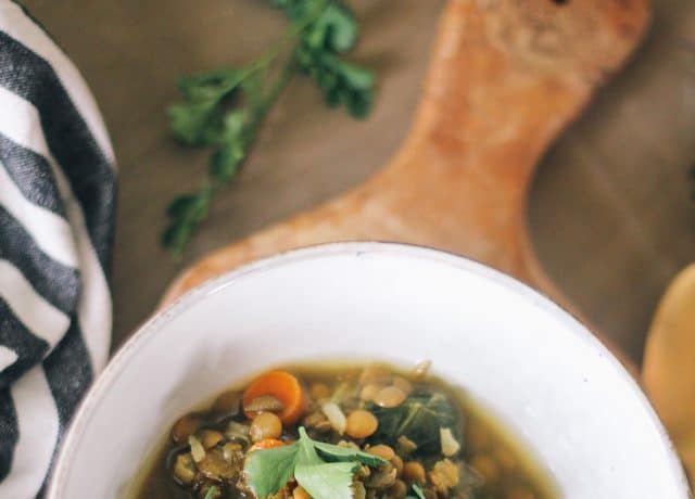 - 1 حبة بصل، متوسطة الحجم، مقطعة مكعبات - 5 فص ثوم مفروم - 4 ساق كرفس، مقطع مكعبات - 5 حبة جزر، مقشر ومقطع مكعبات - 2/1 1 كوب عدس - 2/1 1 كوب قرنبيط - 1 ملعقة صغيرة كركم - 2/1 ملعقة صغيرة مسحوق الزنجبيل - 1 ملعقة صغيرة كزبرة - 2/1 ملعقة صغيرة كمون - 2 ورق لورا - 4 – 5 غصن الزعتر الطازج - 6 – 8 كوب مرق الخضار - 2 كوب سبانخ - ملح وفلفل - بقدونس مفروم، للتزيين