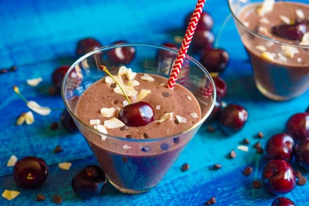 · 4/3 كوب حليب جوز الهند<br /> · 2/1 كوب كرز مجمد<br /> · 2/1 1 حبة موز ناضج<br /> · 4/1 كوب أفوكادو مهروس<br /> · 2 ملعقة صغيرة مسحوق الكاكاو الخام<br /> · مبشور جوز الهند، للتقديم<br /> · رقائق الشوكولاتة، للتقديمطريقة التحضير :