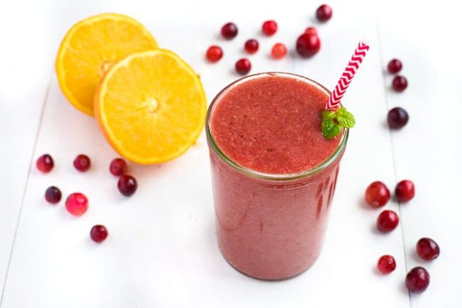 • 1 حبة برتقال<br /> • 1 كوب عصير توت غير محلى<br /> • 4/1 كوب ماء بارد<br /> • 1 حبة موز <br /> • 1 ملعقة صغيرة قرفة<br /> • 4/1 ملعقة صغيرة جوزة الطيب<br /> • عسل أو سكر الفاكهة، حسب الذوقطريقة التحضير :