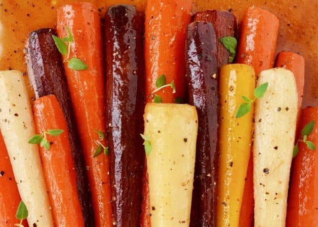 • 16 حبة جزر ملون متوسط الحجم<br /> • 3 ملعقة كبيرة زيت زيتون<br /> • 2/1 كوب عسل<br /> • زعتر طازج أو أي نوع من الأعشاب، للتزيين<br /> • 1 ملعقة صغيرة ملح<br /> • 2/1 ملعقة صغيرة فلفل أسودطريقة التحضير :