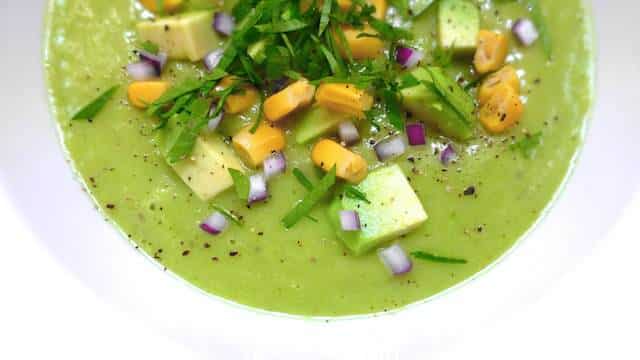 • 125 جرام من الخيار • 1 حبة أفوكادو كبيرة ناضجة • ¾ كوب ( 180 مل ) من مرق الخضار • 1 فص ثوم • ¼ حبة بصل أحمر صغيرة • ذرة حلوة معلبة • باقة من الكزبرة الخضراء المفرومة ناعم • 1 ملعقة كبيرة زيت زيتون • ملح وفلفل أسودطريقة التحضير :