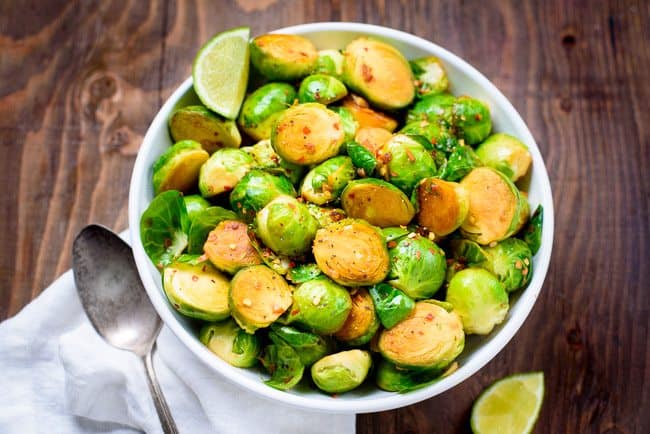 • 450 جرام ملفوف البروكسل • 2 ملعقة كبيرة زيت جوز هند • 2 فص ثوم مفروم • 2 ملعقة صغيرة صوص الصويا • 1 ملعقة صغيرة سكر دايت • رقائق الفلفل الأحمر، حسب الذوق • عصير الليمون، للتقديمطريقة التحضير :