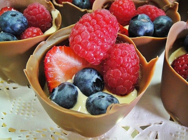 وزعى التوت المشكل على سطح أكواب الشوكولاته وقدميه على