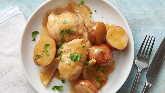 • 2/1 كوب مرق الدجاج • 4/1 كوب + 1 ملعقة كبيرة عسل • 5 ملعقة صغيرة ثوم مفروم • 1 ملعقة صغيرة ملح • 2/1 ملعقة صغيرة فلفل أسود • 675 جرام بطاطس، صغير الحجم ومقطعة أنصاف • 8 قطع أفخاذ الدجاج، منزوعة الجلد • 2 ملعقة كبيرة ماء بارد • 2 ملعقة كبيرة نشا الذرة • 2 ملعقة كبيرة زبدة • 2 ملعقة صغيرة صوص الصويا • بقدونس طازج مفرومطريقة التحضير :