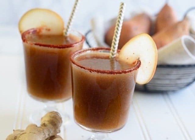 • 1 كوب ماء جوز الهند<br /> • 1 كوب شرائح الكمثرى<br /> • 2/1 حبة موز مجمد<br /> • 2/1 ملعقة صغيرة مبشور الزنجبيل الطازج<br /> • 4/1 ملعقة صغيرة قرفةطريقة التحضير :
