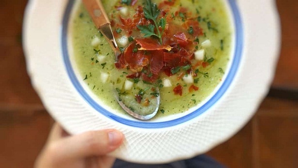 انقلى شوربة الشمام إلى أطباق التقديم وزينيها بالبسطرمة