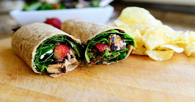 • 2 صدور دجاج بدون جلد وعظم<br /> • 1/2 كوب خل بلسمك<br /> • اوراق خضراء مختلفة للسلطة ( خس – جرجير- كالي – بقدونس- ريحان)<br /> • 12 حبة فراولة<br /> • 4 بصل أخضر مقطع شرائح<br /> • 1/4 كوب جوز مفروم<br /> • 1/2 كوب من جبن الماعز ( عكاوى أو حلقوم)<br /> • 6 من خبز التورتيلا حجم كبيرطريقة التحضير :