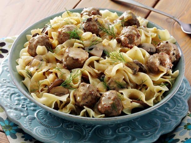 2 ملعقة كبيرة دقيق2 كوب مرق دجاج2 ملعقثة كبيرة صلصة ورشستر ( توجد الوصفة بالموقع )1 ملعقة كبيرة مسطردةكيس كرات لحم مجمدة1 بصلة صغيرة مفرومة ناعماًكوب مشروم مقطع شرالئحكوب قشطة2 ملعقة كبيرة شبت2 ملعقة صغيرة ملحربع ملعقة صغيرة فلفل أسودكيس نودلز مطبوخة حسب تعليمات الوصفةطريقة التحضير :