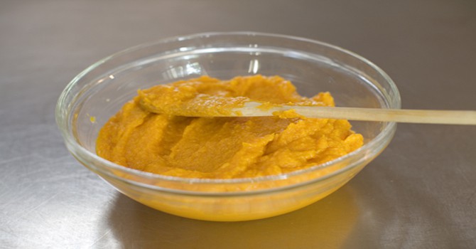 · ضعي القرع في محضر الطعام أو الخلاط مع اضافة القليل من الماء ليسهل هرس
