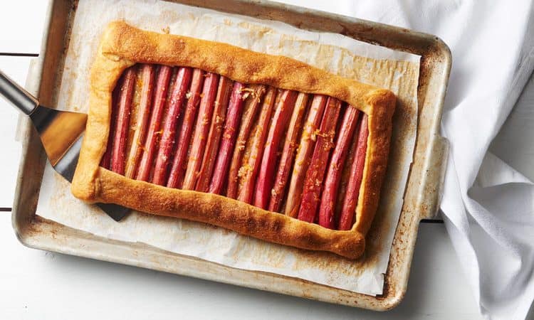 · غطي الراوند بشكل جيد بخليط سكر البرتقال ثم رصيه على سطح العجين.