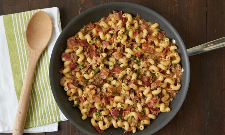 ·       أضيفي المكرونة المسلوقة وشرائح اللحم المقدد المقلي، قلبي مرة أخرى حتى