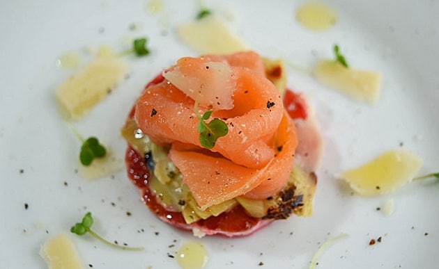 الخرشوف و البرتقال الأحمر فوقه شرائح سخية من السلمون المدخن ( سيمون فيميه )