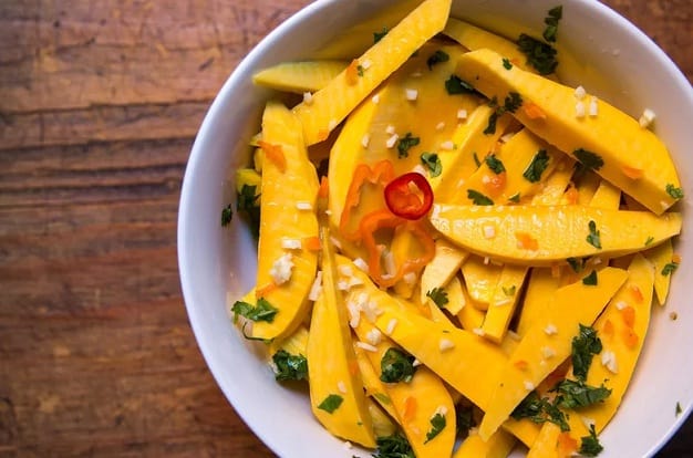 · تناولي سلطة المانجو بالفلفل والثوم باردة واستمتعي بها.