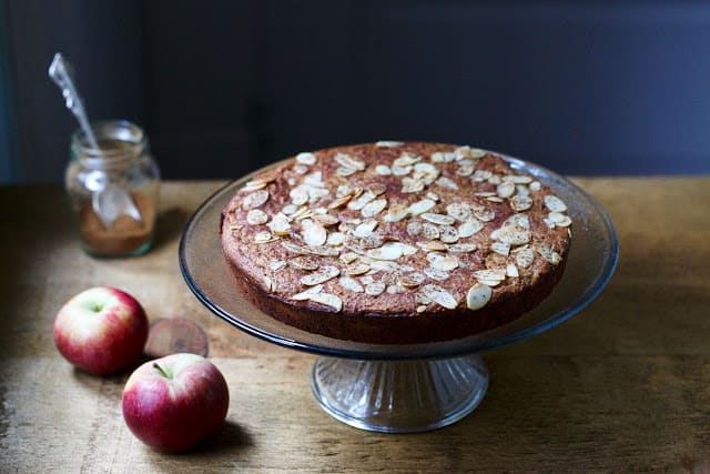 ثم وزعي شرائح اللوز على سطح الكيك ورشي مزيد من مسحوق القرفة.