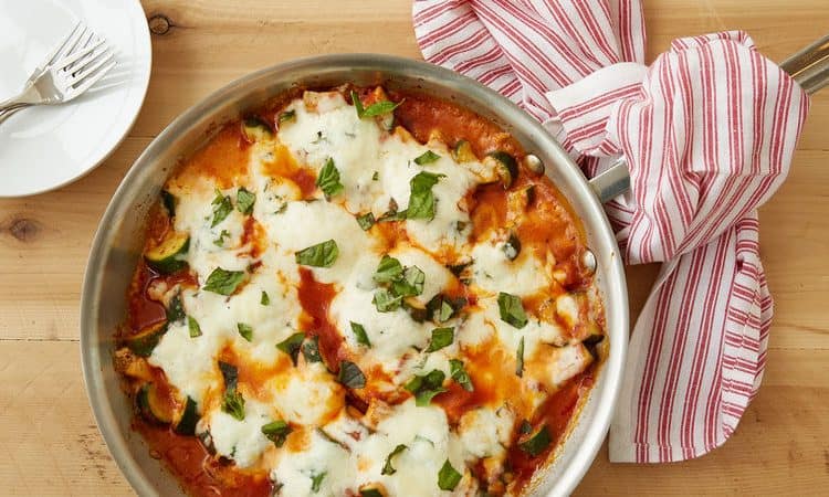 • 1 ملعقة كبيرة زيت زيتون • 2 كجم كوسة • 4/1 ملعقة صغيرة ملح • 4/1 ملعقة صغيرة فلفل • 2/1 1 كوب دجاج مطبوخ ومفروم • 2/1 1 كوب صلصة المكرونة • 1 كوب جبن الريكوتا • 4/1 كوب مبشور جبن البارميزان • 4/1 كوب أوراق الريحان المفروم • 2 كوب مبشور جبن الموتزاريلاطريقة التحضير :