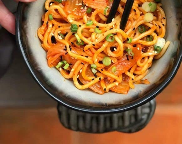 • 3 ملعقة كبيرة كيمتشى ( أو ملفوف ) • 3 ملعقة كبيرة صلصة كيمتشى • 125 جرام نودلز مسلوقة ( شعيرية صينية ) • 1 حبة بصل أخضر صغيرة مقطعة شرائح رقيقة • 1/3 كوب ( 80 مل ) من الماء • 1 مكعب مرق خضار • 1 ملعقة كبيرة معجون الفلفل الحار الكورى • 1 ملعقة صغيرة زيت نباتى • 1 ملعقة صغيرة معجون طماطم • بودرة ثوم
