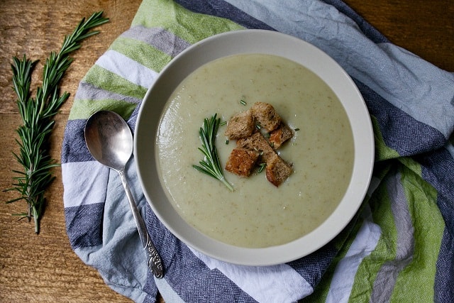 • 675 جرام خرشوف قدسي (بطاطا قصبية)<br /> • 1 حبة بطاطس كبيرة الحجم<br /> • 1 حبة بصل<br /> • 3 فص ثوم مفروم<br /> • 3 كوب مرق الخضار<br /> • 1 كوب حليب<br /> • 1 ملعقة كبيرة زيت زيتون أو زبدة<br /> • 2 غصن روزماري (زعتر) طازج<br /> للخبز المحمص بالزعتر:<br /> • شرائح الخبز<br /> • زيت زيتون<br /> • ملح خشن<br /> • زعتر طازجطريقة التحضير :