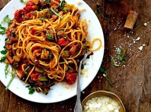 • 2 كوب مكعبات كوسا • 2 كوب مكعبات باذنجان • 1 حبة بصل مقطعة مكعبات • 3 كوب طماطم كرزية • ¼ كوب زيت زيتون • 4 فص ثوم مفروم • 1 حبة بصل متوسطة مفرومة • 5 حبة طماطم مجففة بالشمس مفرومة • 1 ملعقة كبيرة معجون طماطم • 1 ملعقة صغيرة أعشاب إيطالية مجففة • ¼ ملعقة صغيرة زعتر مجفف • ¼ ملعقة صغيرة ريحان مجفف • 4/1 1 ملعقة صغيرة من الملح • ¼ ملعقة صغيرة فلفل أسود • 225 جرام باستا ( مكرونة مسلوقة ) • ريحان طازج للتزيين • بقدونس مفروم للتزيين • جبن بارميزانطريقة التحضير :