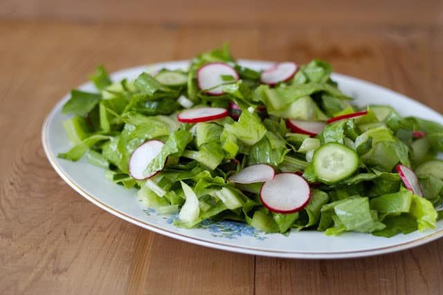 في وعاء كبير، ضعي الخس والبصل الأخضر والفجل والخيار.
