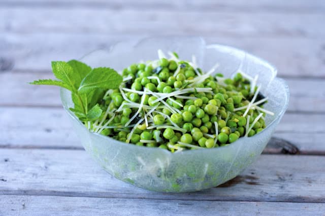 قومي بطهي البازلاء لمدة 2 دقيقة في الماء المغلي ثم