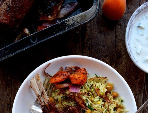 • مقادير خلطة الريش التركية :- • 1 حبة بصل كبيرة مقطعة شرائح • 5 حبة مشمش • ملح وفلفل أسود • زيت زيتون • 2 ريش لحم ضانى • 1 ملعقة كبيرة بابريكا • 1 ملعقة صغيرة رقائق الفلفل الأحمر الحار • 1 ملعقة صغيرة مسحوق الثوم • 1 ملعقة صغيرة كمون • 1 ملعقة صغيرة سماق • ¼ ملعقة صغيرة جوزة الطيب • 1 ملعقة صغيرة قرفة • 1 ملعقة صغيرة نعناع مجفف • 1 ملعقة صغيرة الأعشاب مجففة • مقادير الأرز بالحمص والبصل المقرمش :- • 2 ملعقة كبيرة زيت زيتون • 2 ملعقة صغيرة بذور الكمون • 1 ملعقة صغيرة مسحوق الكارى • 1 علبة حمص • 1 حبة بصل مقطعة شرائح رقيقة • 1 ملعقة كبيرة طحين • ½ كوب زيت نباتى • 2 كوب أرز بسمتى مطهى • 2 ملعقة كبيرة بقدونس مفروم • 1 ملعقة كبيرة كزبرة مفرومة • ½ كوب زبيب • ½ كوب فستق محمص مفروم ( اختياري ) • ملح وفلفل أسود • مقادير صلصة اللبن الزبادى بالخيار :- • 1 كوب لبن زبادى • 1 حبة خيار صغيرة مقطعة مكعبات • 2 فص ثوم مفروم • 1 ملعقة كبيرة عصير ليمون • 1 ملعقة كبيرة بشر ليمون • ملح وفلفل أسودطريقة التحضير :